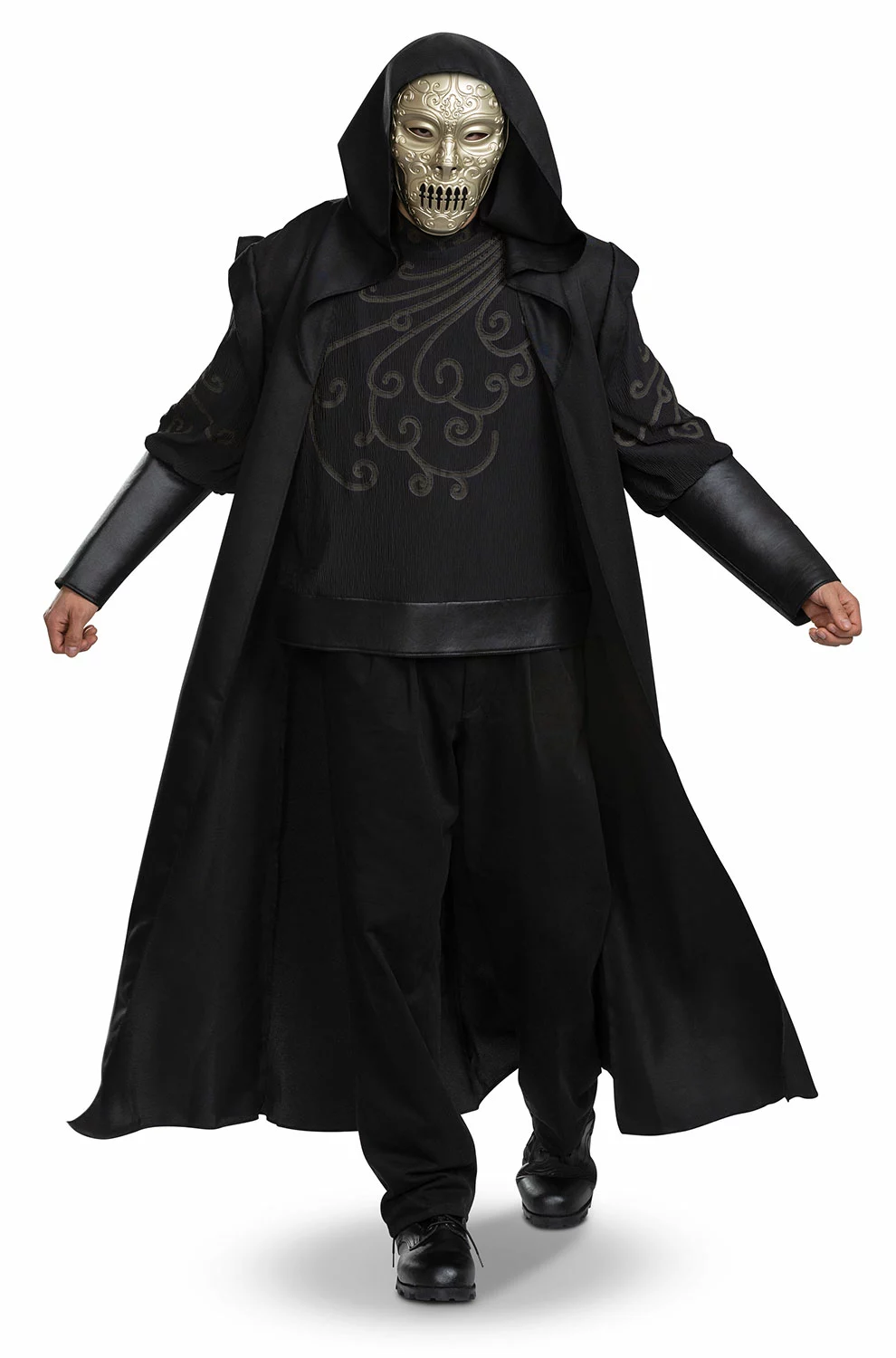 Show your loyalty to Lord Voldemort with this Death Eater Deluxe Adult Costume. Together, you can purify the wizard world from Harry Potter and others just like him. This costume features a black hooded robe with attached shirt with swirl patterns, mask, and even a temporary tattoo for the complete look.