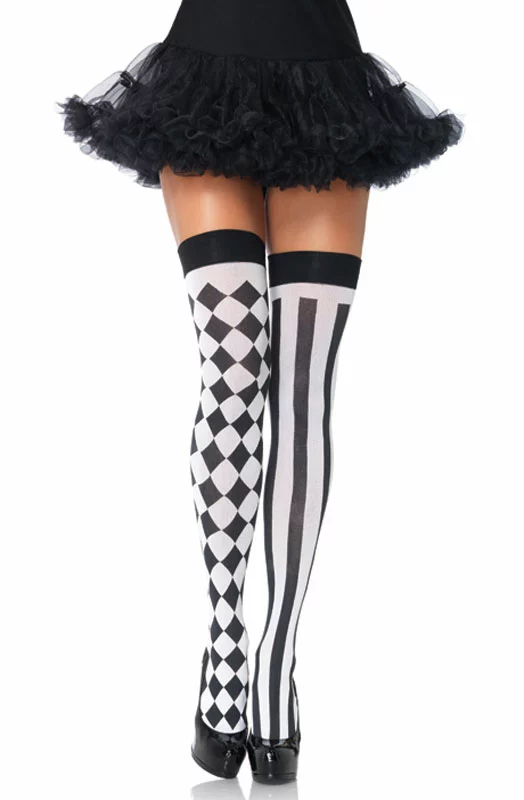 Harlequin Thigh High Stockings features a pair of black and white thigh high stockings in fun diamond and striped patterns. Pair this with any Mardi Gras or harlequin costume for the perfect look!